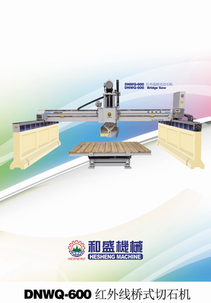 本機采用大跨度橫梁結構, 整體機身重; 橫梁導軌采用進口線性軌道; 機身升降結構采用四立柱式液壓升降, 同時采用專有技術: 立柱及邊梁,在切割時有液壓鎖緊裝置,確保切割時整體機身不晃動, 切割效率好, 板材平整度高, 是切割大規格高價值進口大荒料的理想設備. 1: 機身采用專有技術"液壓鎖緊裝置",在機械有磨損或切割過程中可減小機身間隙,有利于提高板材的平整度和延長刀頭使用壽命 (*選配 Alternative)。